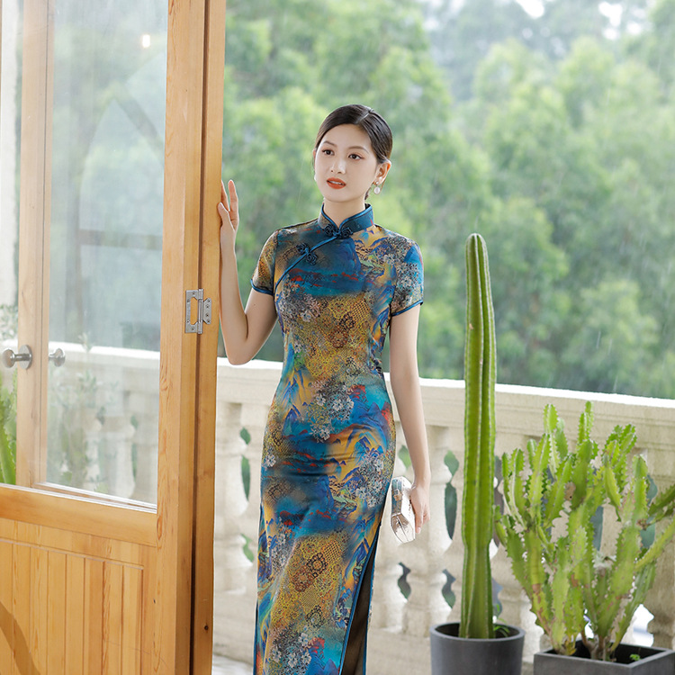 2025春夏チャイナドレスのC0141-Dの長いプリントのチャイナドレスの優雅な半袖のレトロなチャイナドレスの卸売中国式ファッション