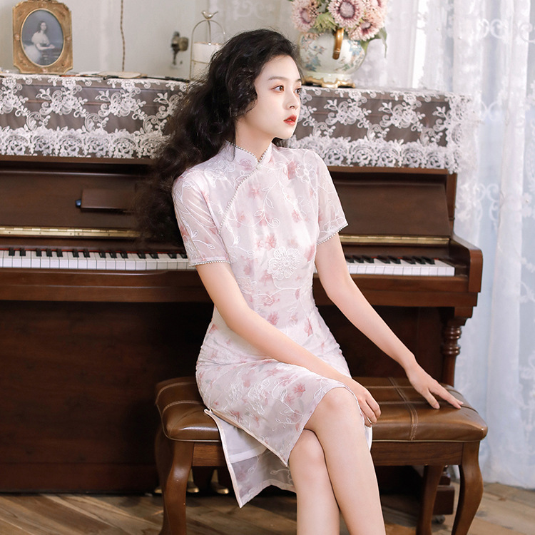 卸売り2023夏秋新型ファッションネット糸清羽刺繍中長旗衿二重修身ワンピース民国復古