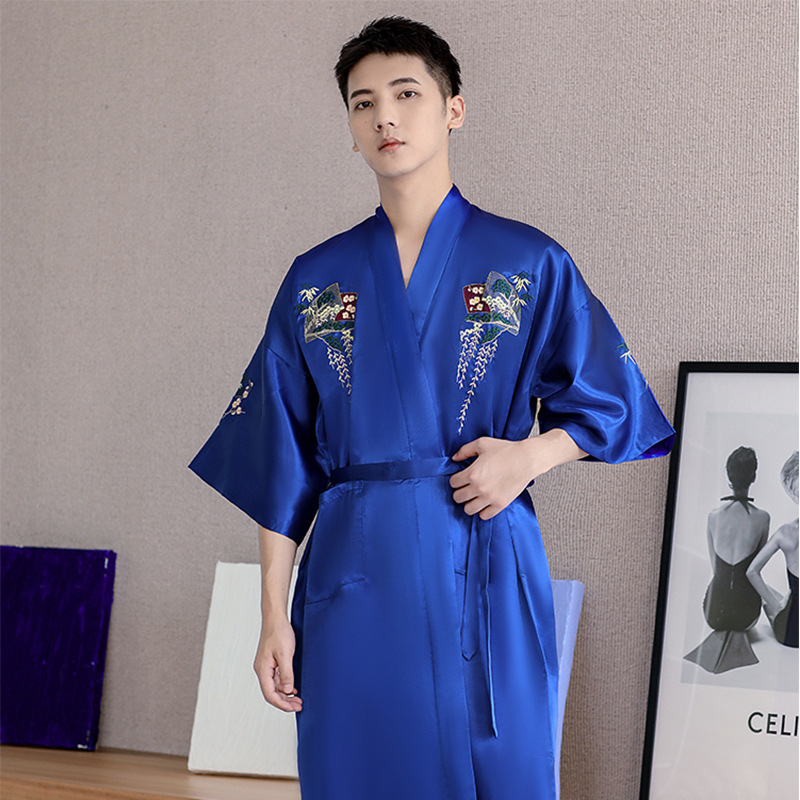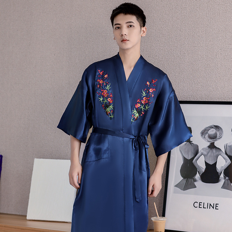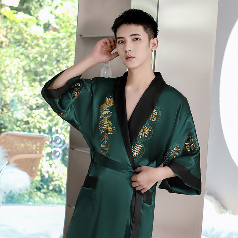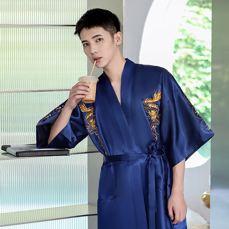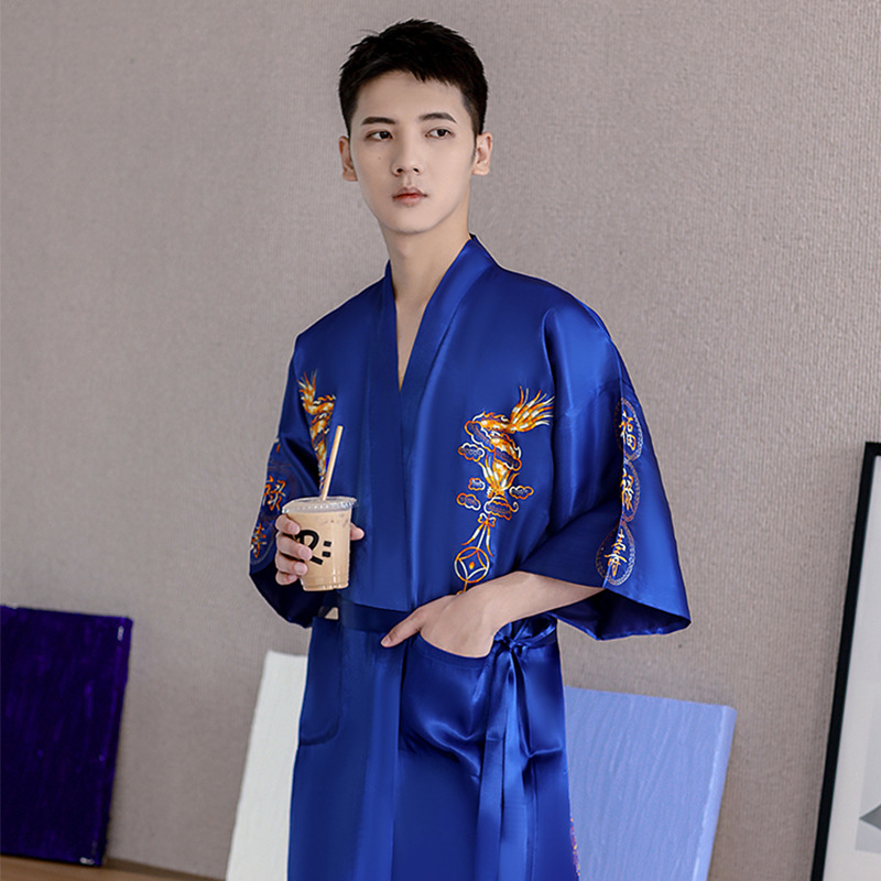 卸売り2023春の新型男性パジャマバスローブ場青中国風龍紋絹織物ゆるい快適ホテル