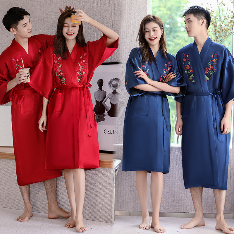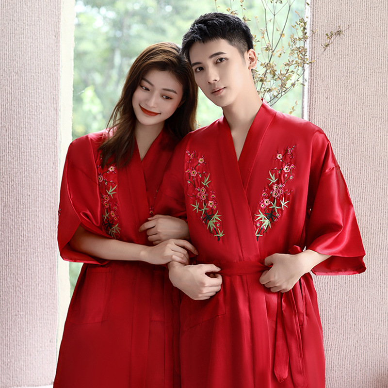 2023春の新しいカップル服男女パジャマバスローブ赤い中国風絹織物ゆるい快適ホテル卸売り