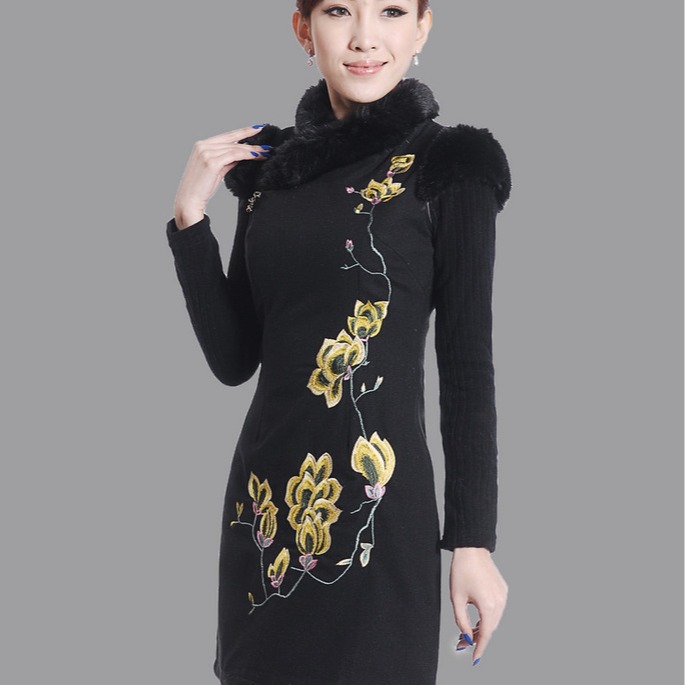 秋冬の新型チャイナドレスのロングタイプのベルベットのスタンドカラーはシンプルで痩せている服のベルベットの演出服のお母さんの女装です