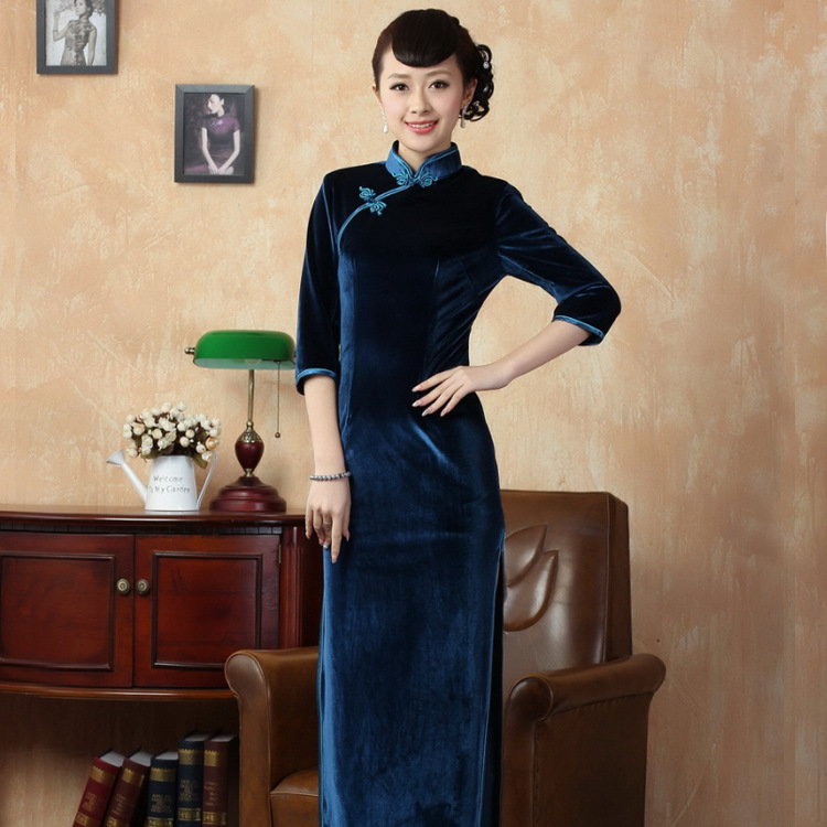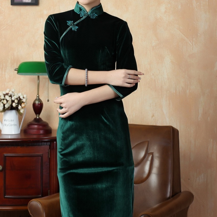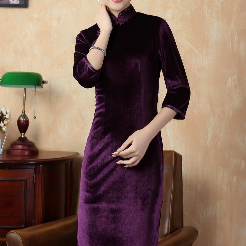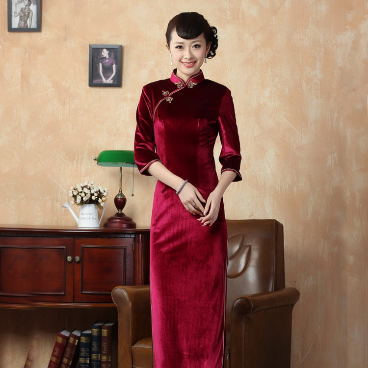 卸売り唐装チャイナドレスtd0005新型純色雍容華貴弾力真ベロアチャイナドレス七分袖