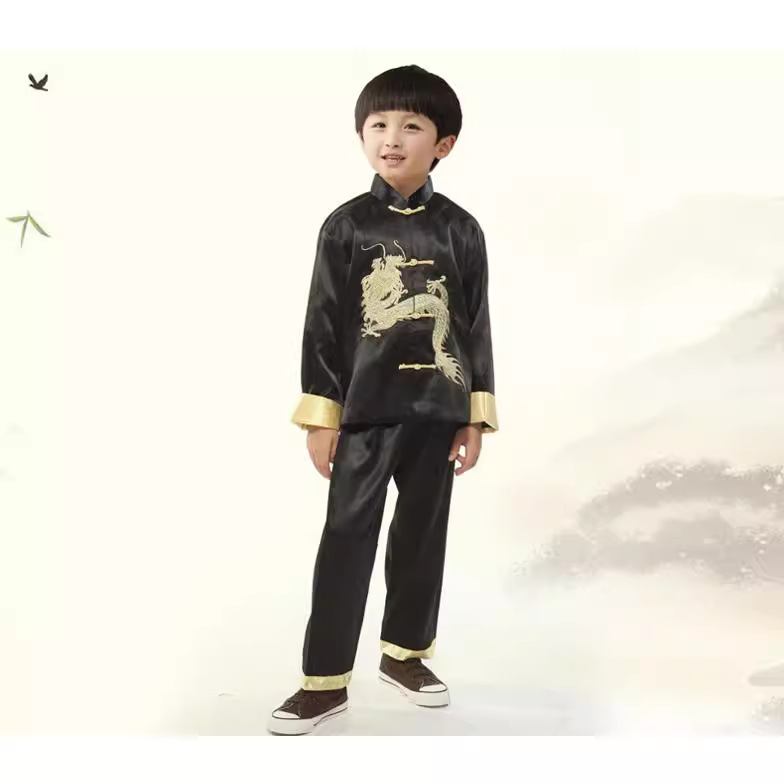 メーカーの卸売りは子供の唐装の新型の小さい人民代表大会の竜のカバーx1020の1件の代行のスーツのズボンを供給します。