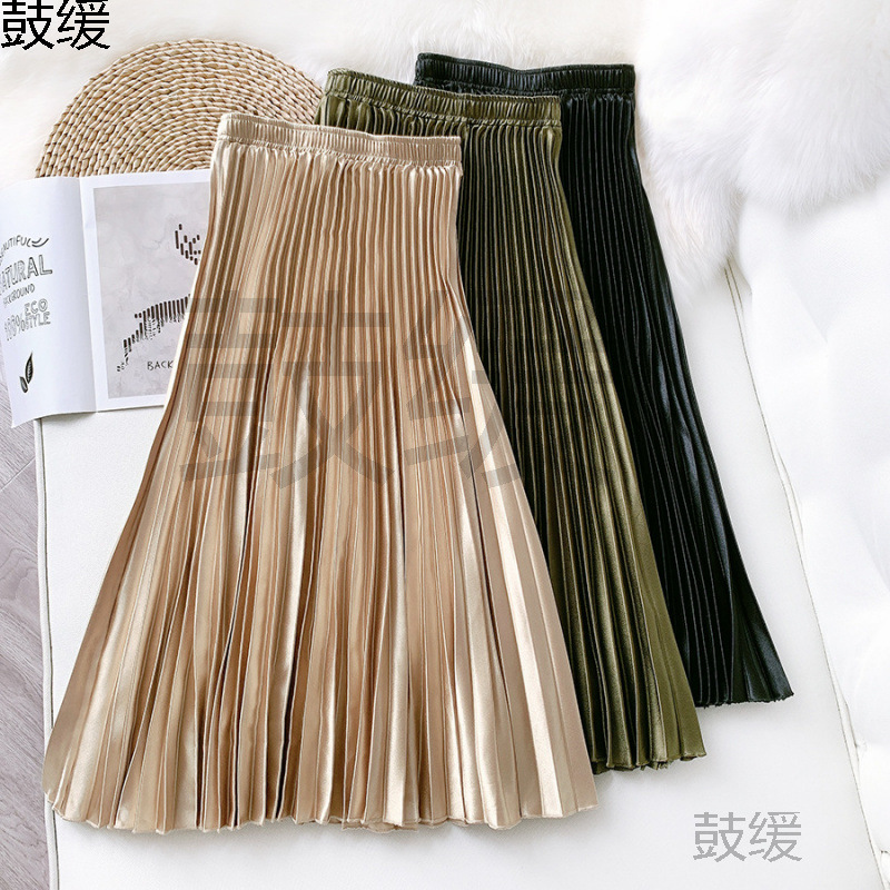 AliExpress クロスボーダーハイウエストサテンメタリックプリーツスカート春と夏の女性のレトロミッドレングススリム A ラインスカート