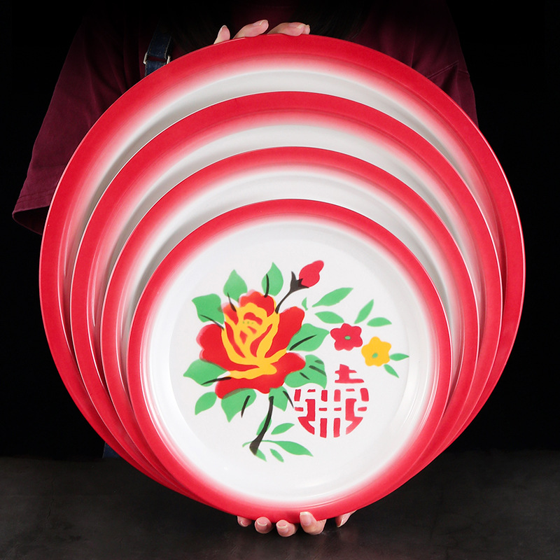 赤い双喜のメラミンのトレーのお祝いはエナメルの鍋のレストランのホテルの結婚祝いの食器の復古の皿のプラスチックの円盤をまねます。