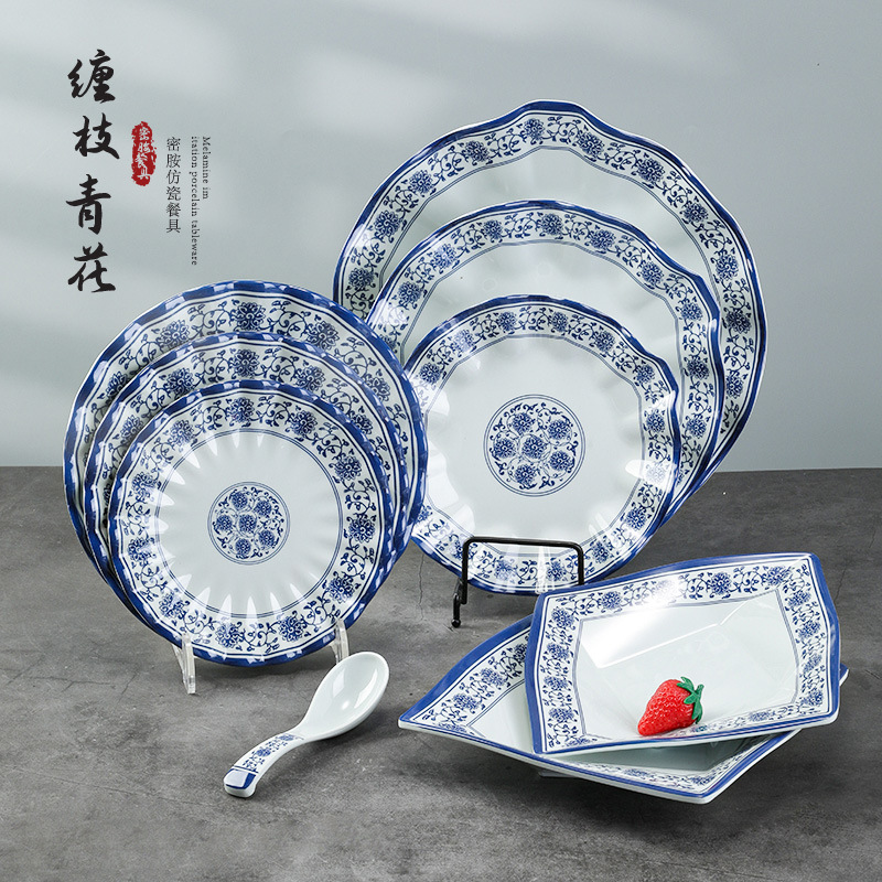 国潮青花磁器皿家庭用高颜値模造陶磁器食器ホテルレストランメラミン料理皿円盤プラスチック皿