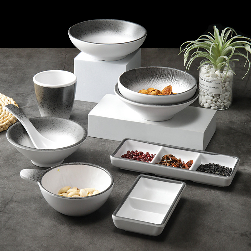 磁器の両耳のスープの皿のプラスチックの料理の皿のホテルのアイデアの冷たい料理の皿のレストランの商用のメラミンの皿の異形の食器