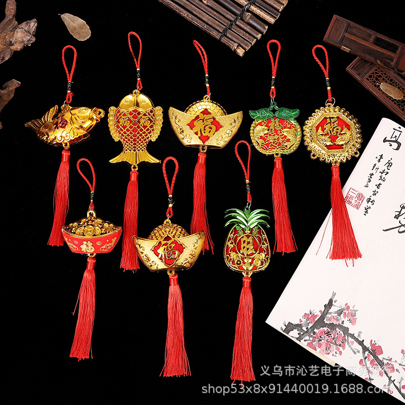 2021新作お祝いレトロ端午の節句の日金色の元宝双魚パイナップル福字リンゴ盆栽飾りストラップ