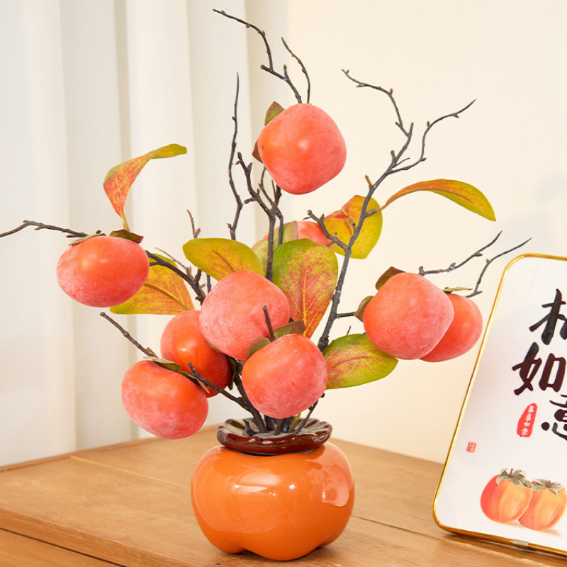 カキの実の枝をシミュレーションして、花の乾いた花のカキの如意の置物の生け花の造花の客間の装飾の飾り物をシミュレーションします。