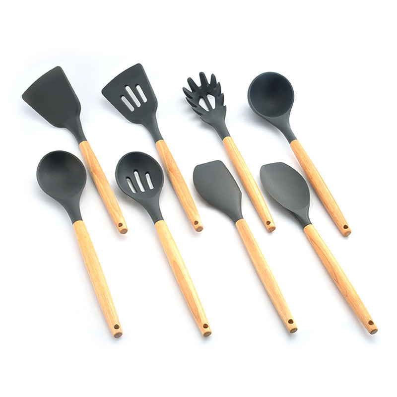 ヨーロッパ式の木の柄のシリカゲルの調理器具の8セットの家庭用の鍋にくっつかないスプーンのツールセットの台所の調理器具セット