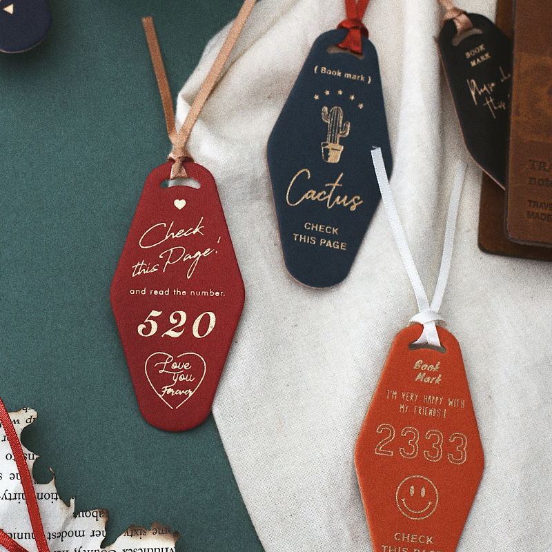 Puの皮のしおりの金の表札のシリーズのラベルのアイデアの鍵の札の学生の本はページのラベルを読みます。