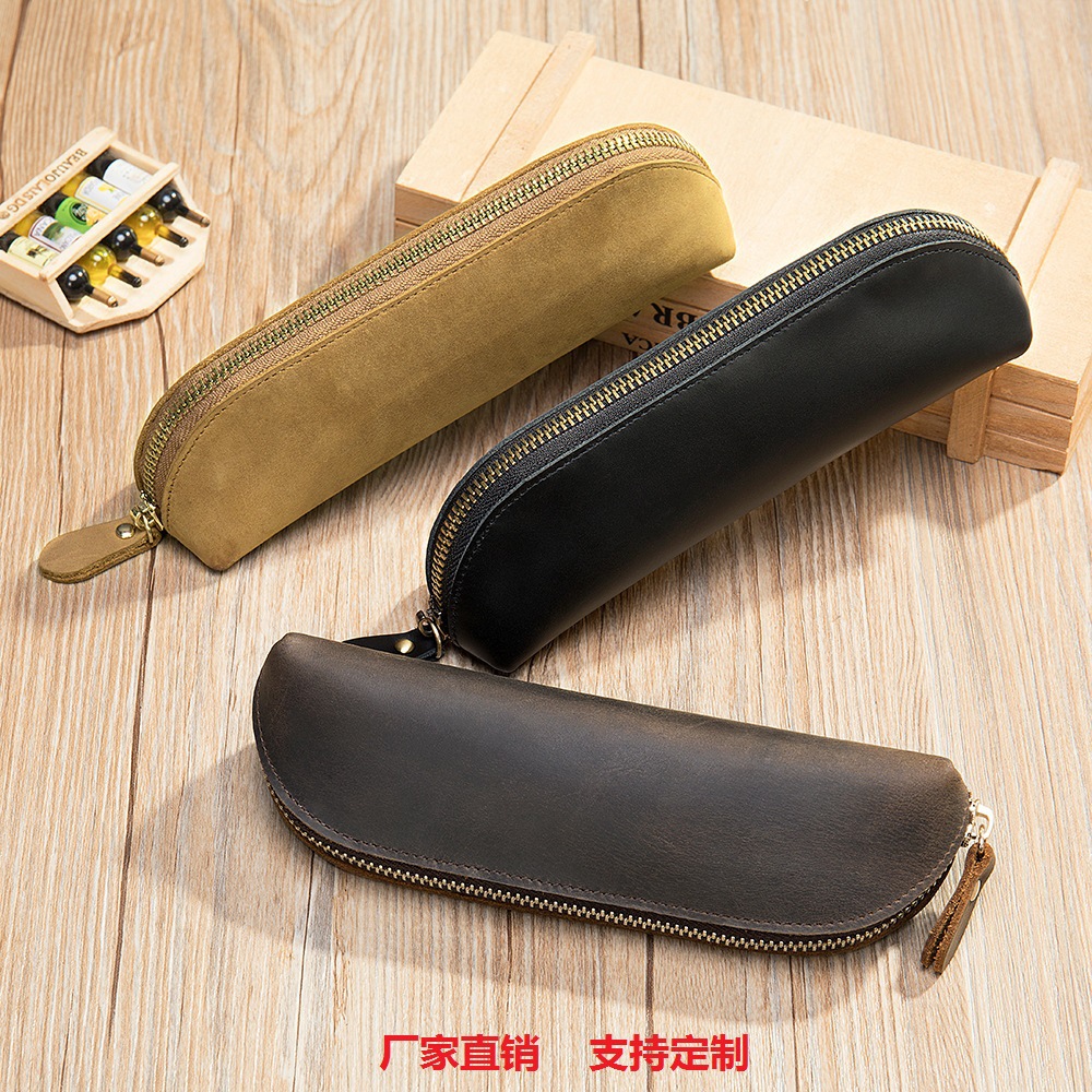 頭層狂馬皮復古純手収納筆箱ファスナー筆袋文房具ペン皮カバー眼鏡収納袋