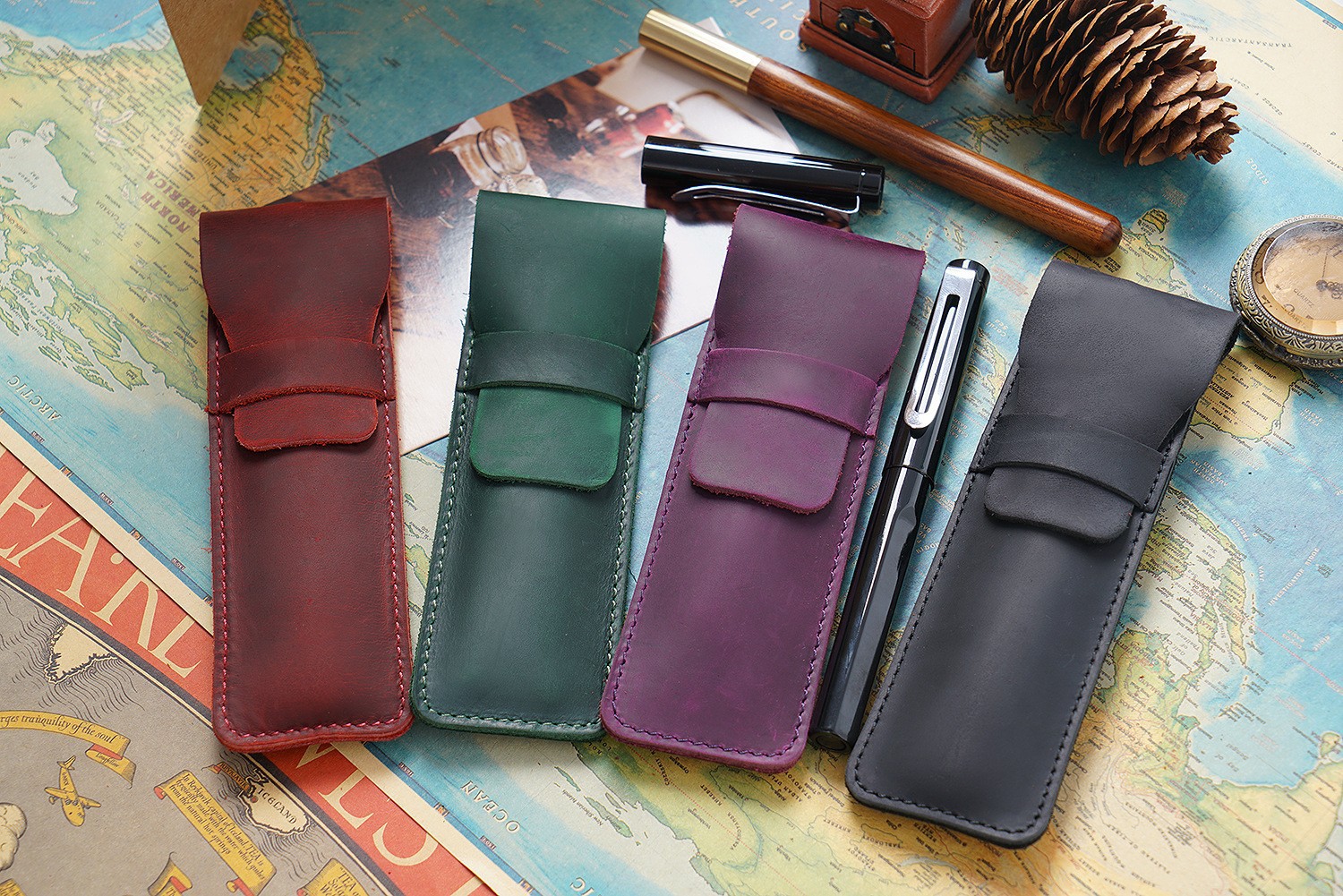 男女通用の純粋な手作りの本革の筆袋の復古の気違いの馬の皮の鋼の筆のカバーのビジネスの事務の保護の筆のカバー