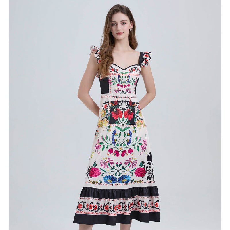 女性用フレンチチューブトッププリントスモールフライングスリーブドレス、海辺での休暇用ビーチスカート、ハイエンドの気質痩身ロングスカート