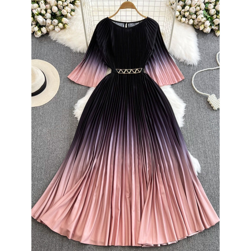 軽熟風名媛気質五分袖丸首腰を収めて痩せているa字の大きなグラデーション色のプリントのワンピース