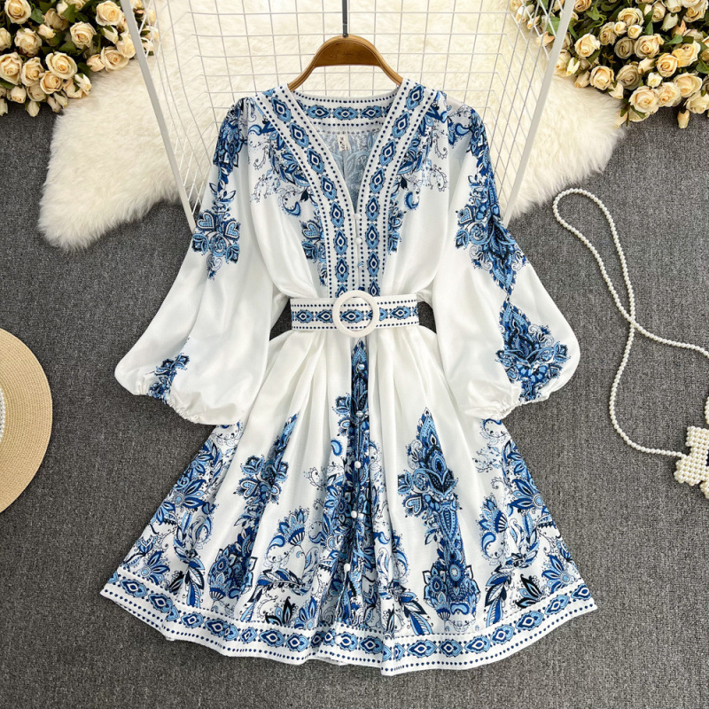 クロスボーダー貿易レトロ宮殿スタイル半袖Vネックウエスト痩身シングルブレストAライン青磁プリントドレス