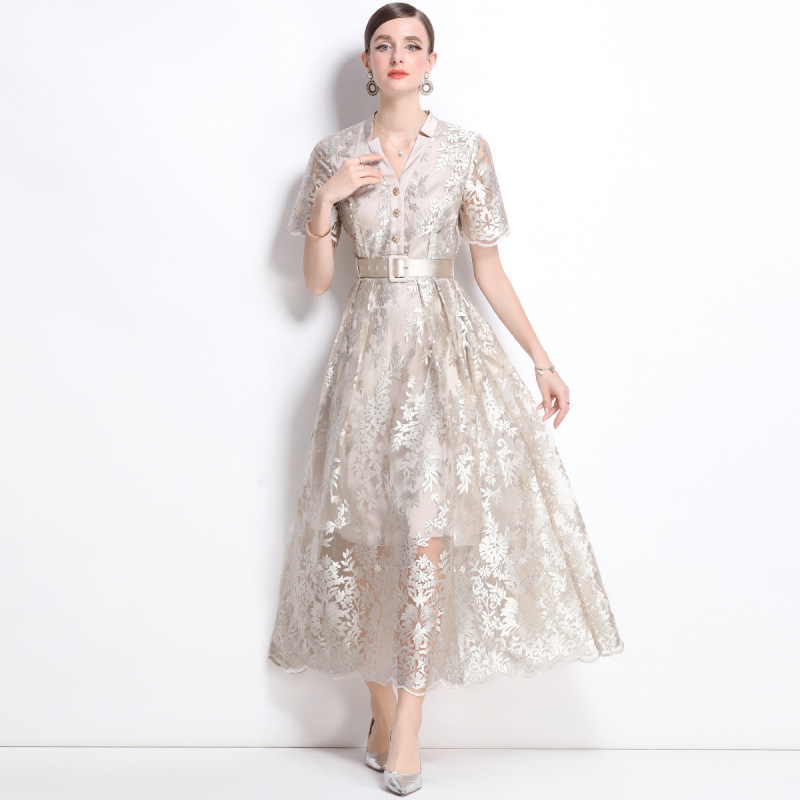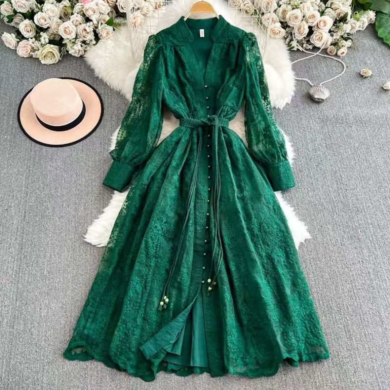 新型女装フレンチレトロ高級感気質優雅まつげレースワンピースハイウエスト着痩せロングドレス