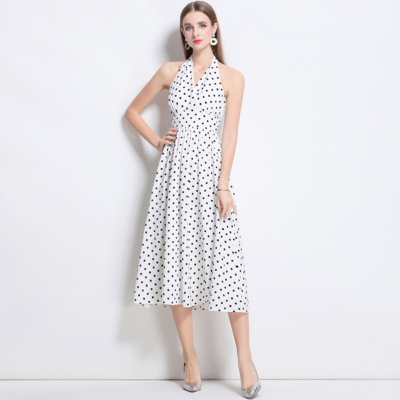 香港風レトロな波点首のワンピース女性2025春の新型フランスvネックは腰を収めて痩せた気質のスカートを見せます。