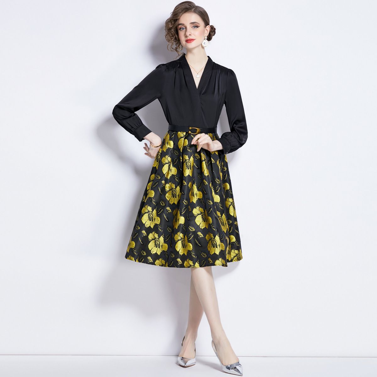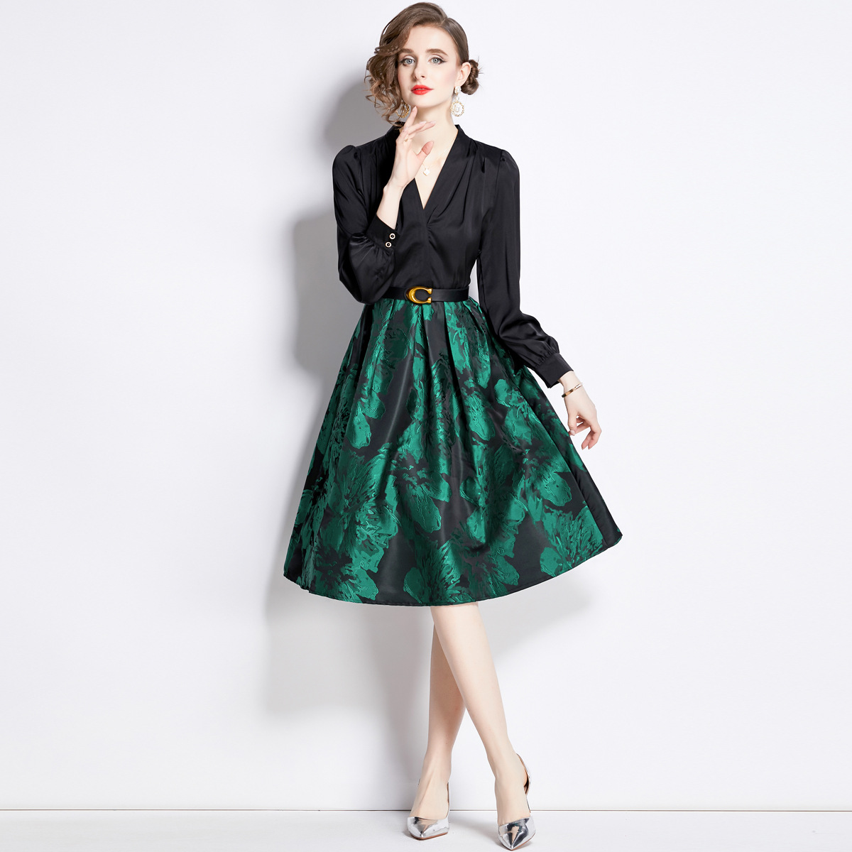 宮廷風気質ワンピース春装女性セクシーvネックデザイン感衝突色ステッチレトロジャカードドレススカート
