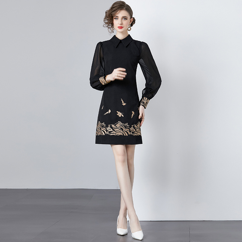 重工刺繍折り襟a字スカート小衆デザイン遮肉減齢長袖ワンピース女2024春の新商品