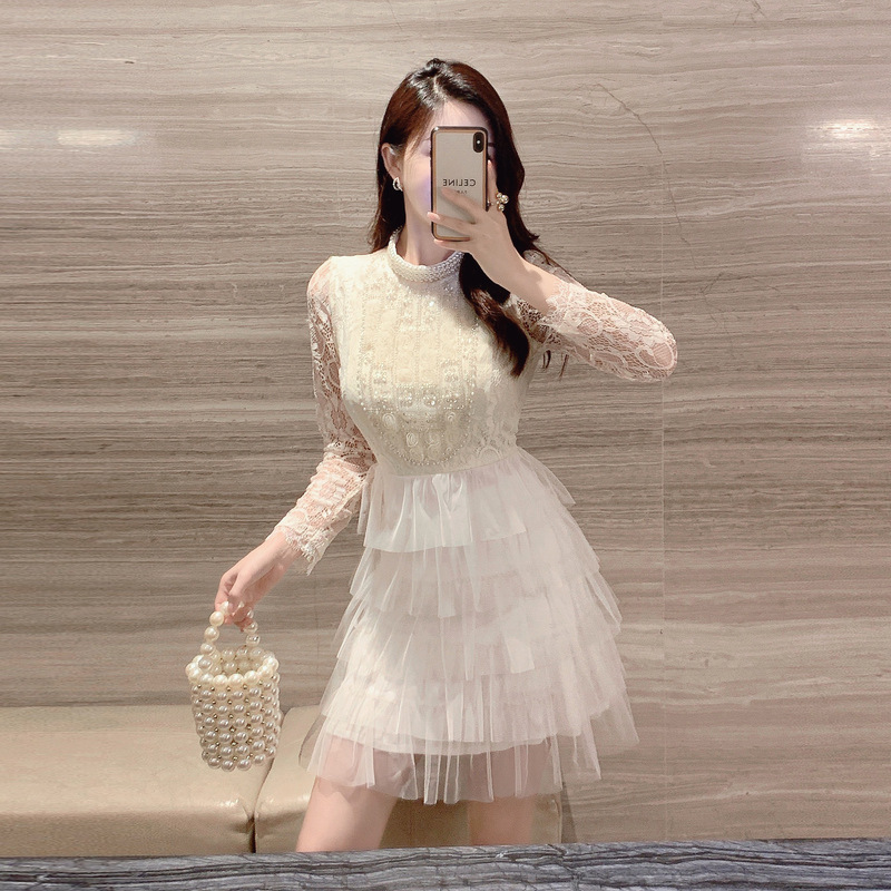 2024新型重工釘珠純欲風レースワンピース透かし網糸ベーススカート