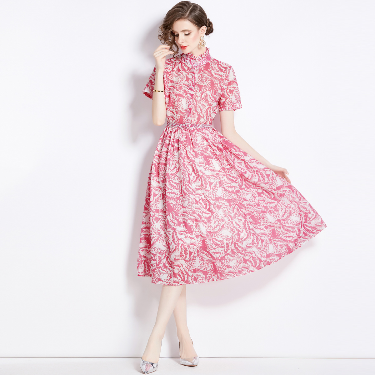 2024位置決めプリント灯籠袖百タック流蘇ベルトワンピース