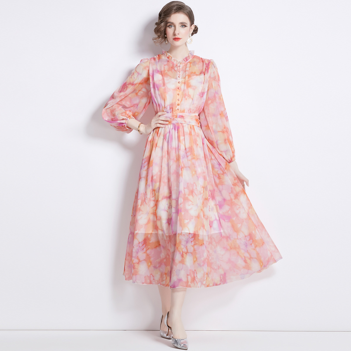 フランスの花のシフォンの長袖のワンピースの女性の早春の2024新型のデザイン感の独特なお姉さんの優しい風のロングスカート