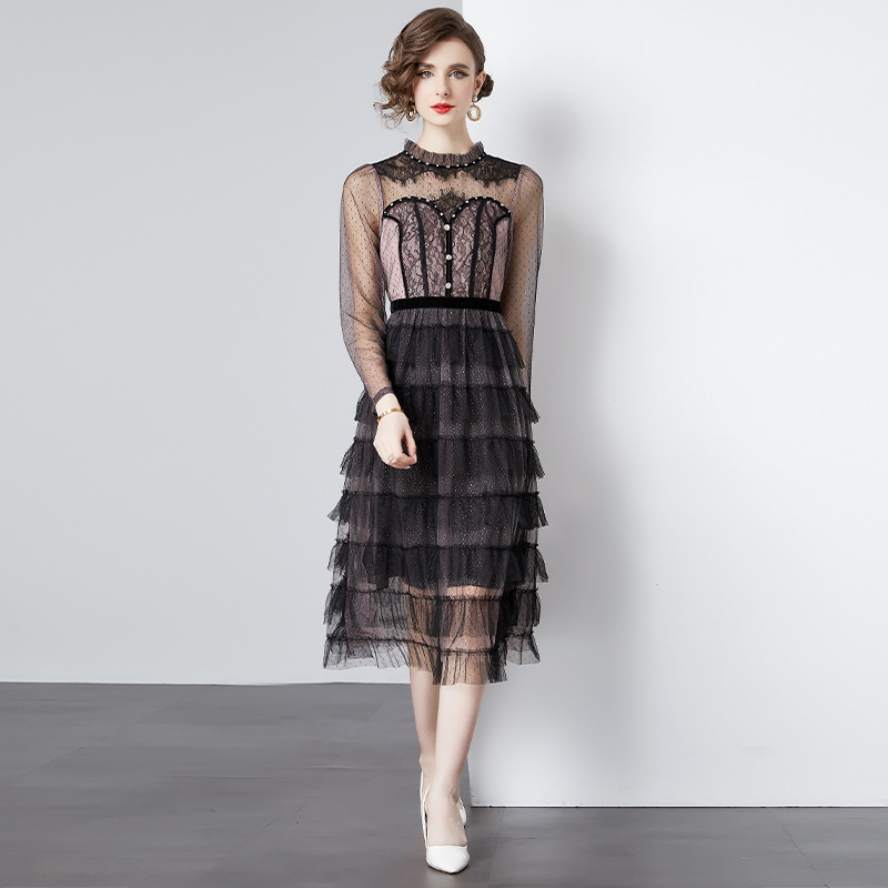 2025年春夏新作レディース年次総会ドレス、威圧的な長袖ブラックレースワンピース、ケーキドレス