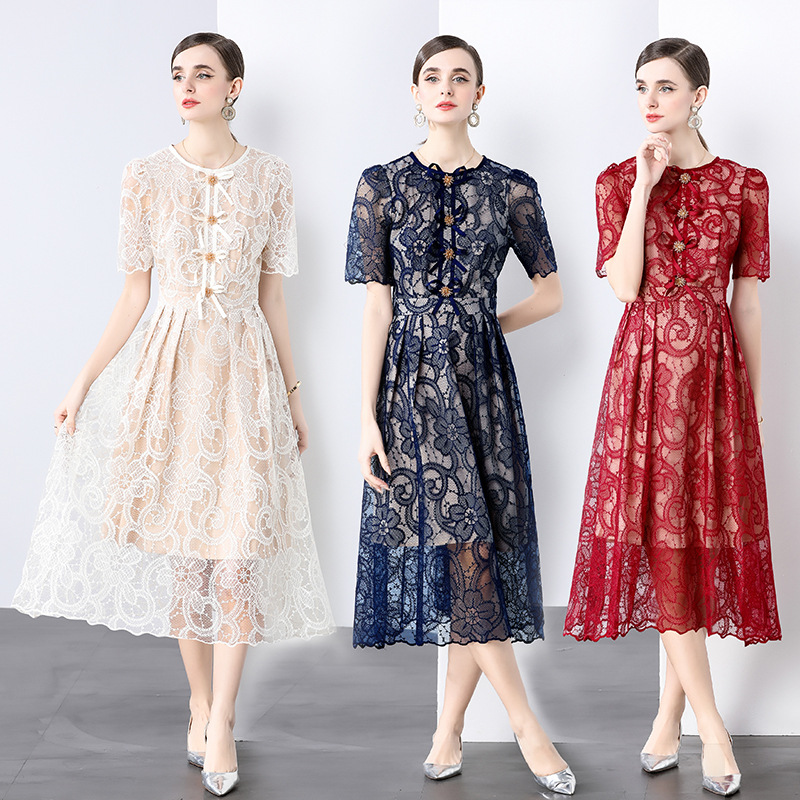 フランスのレトロな気質のワンピースの女性の重工の刺繍の花の丸首の泡の袖のレースは腰を収めてやせている大きいスカートを現します。