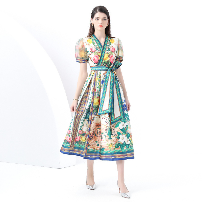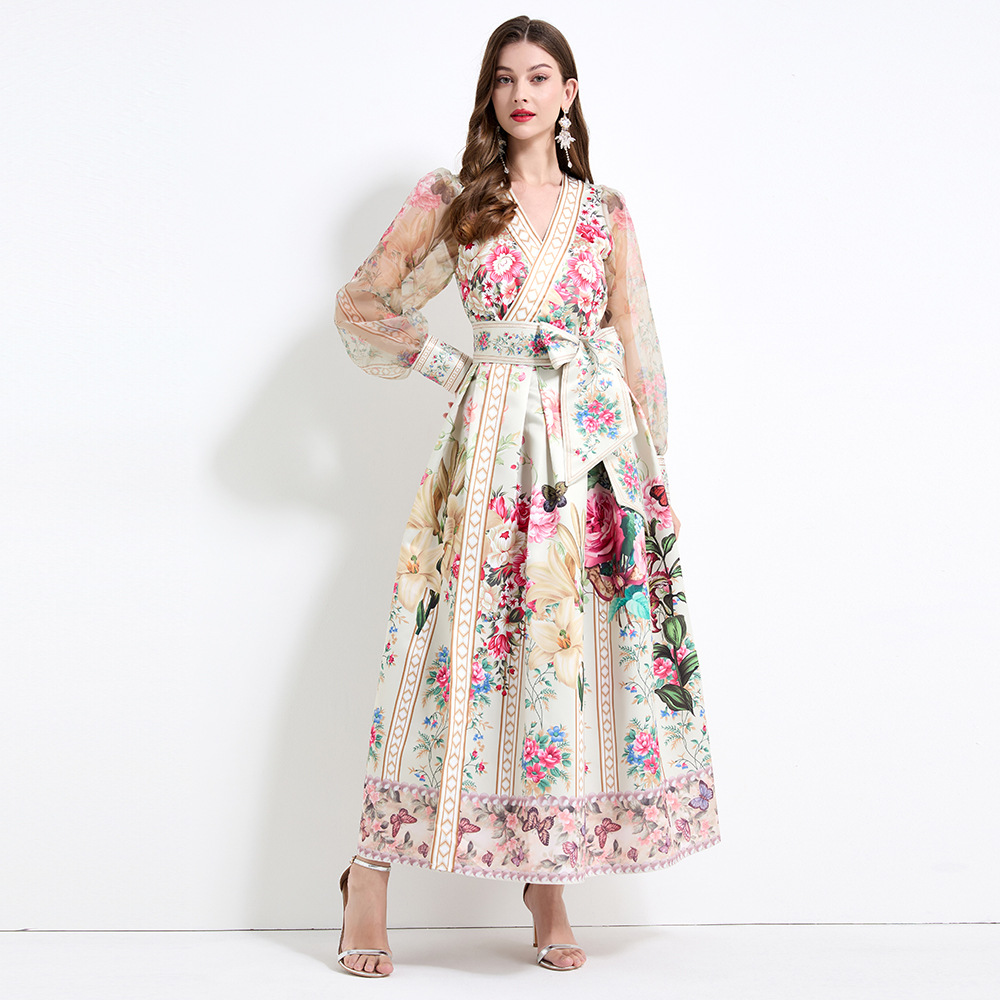 欧米の宮廷風の気質のレトロなvネックの網の紗の灯籠の袖はベルトを締めて腰のデザイン感を収めて大きくプリントのワンピースを並べます。