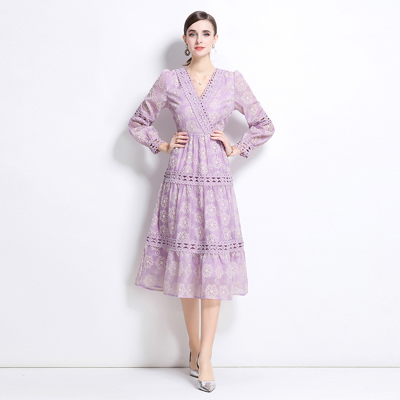 欧米風の優雅なvネックの単列は重工業のフックの花の刺繍の灯籠の袖のひもを掛けて腰を収めて大きい長のワンピースを並べます。