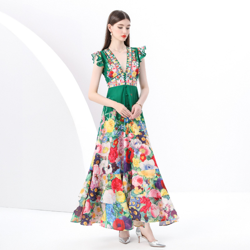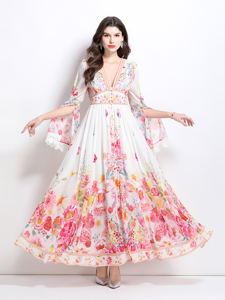 宮廷風ワンピース女性2025春装欧米名媛深v襟ラッパ袖ウエストボタンプリント長スカート