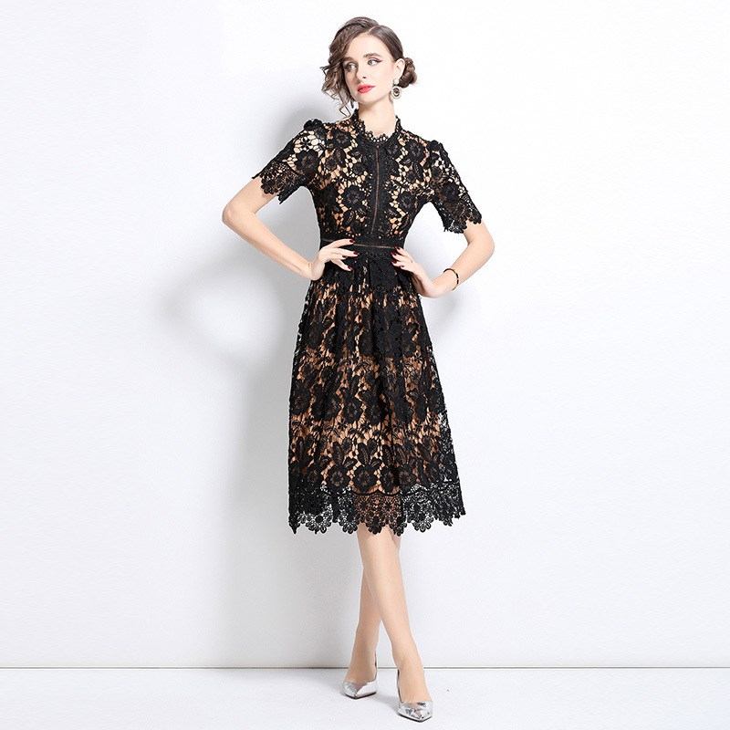 フランスのレトロな小衆立襟のハスの葉の辺は腰の透かし彫りの刺繍の半袖のワンピースの女性の夏をつなぎ合わせます。