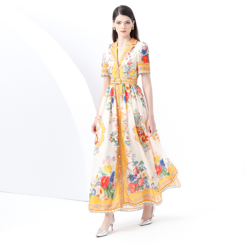 2025早春-リゾート風スーツ襟半袖広々とした波の花のプリントのロングワンピース