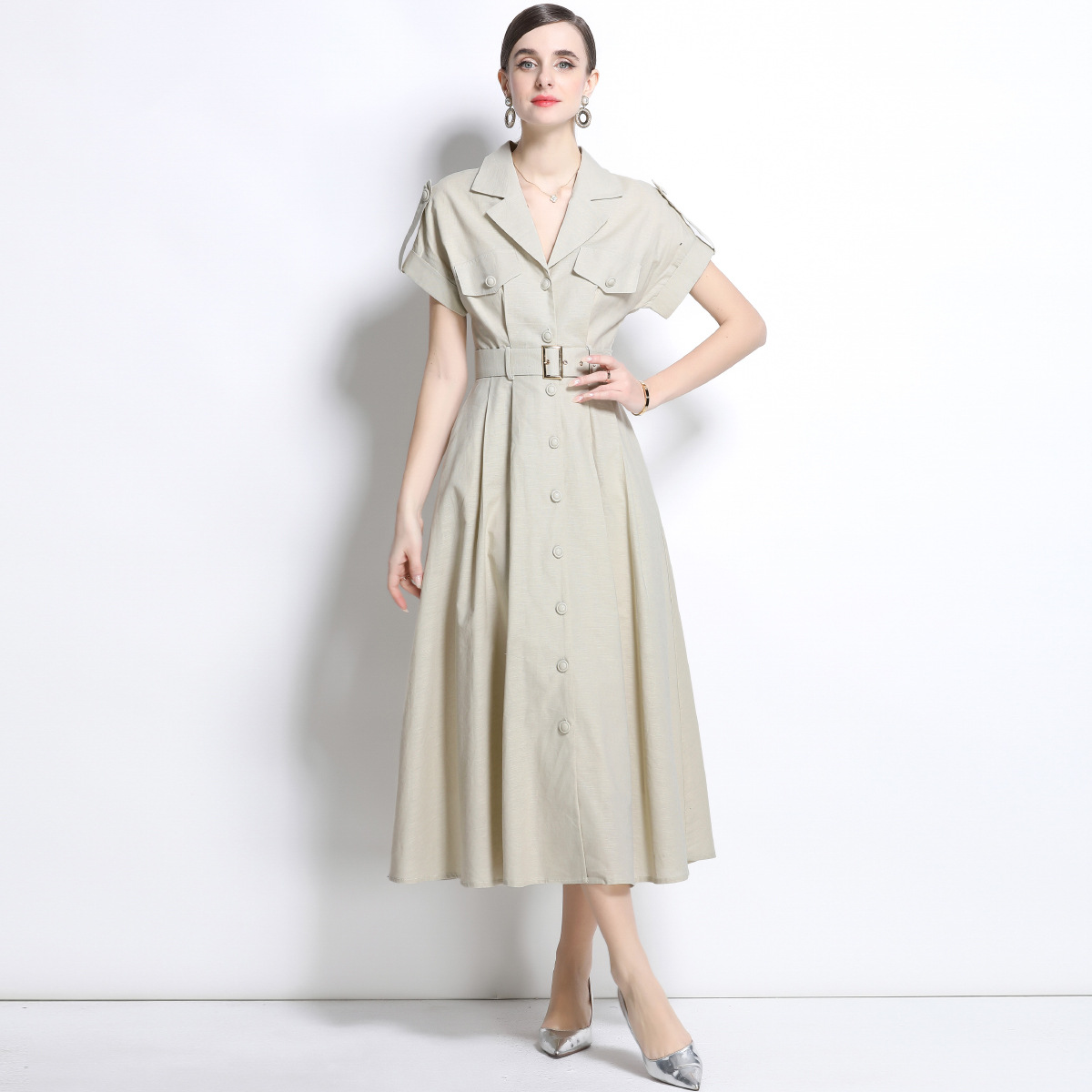 軽くて豪華な英倫風のスーツの襟のワンピースの女性の夏の単列のボタンのベルトは独特な気質の名媛の長いスカートを設計します。