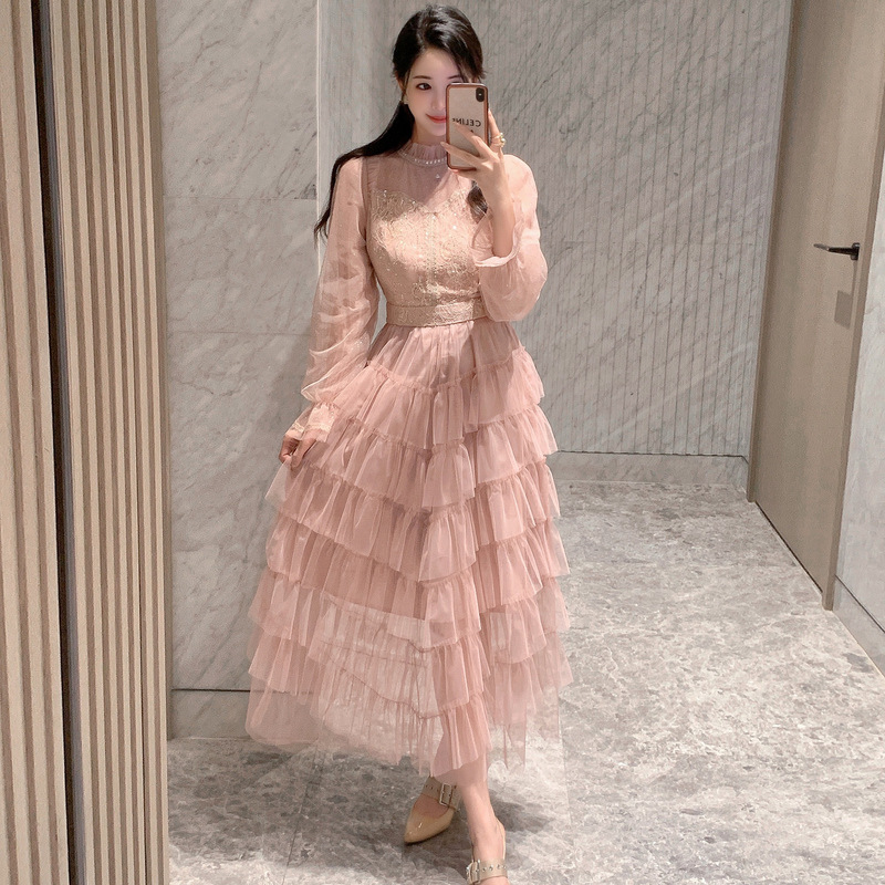 2025春のフランス式の優雅なスパンコール刺繍透視網の長袖は腰を収めてやせているケーキの蓬蓬のワンピースの女性を現します。