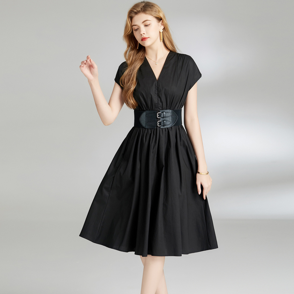 黒いヘボン風が腰を収めて痩せているワンピース女性2024夏の新しい気質vネックが腰を束ねて黒いドレスのスカートを修理する