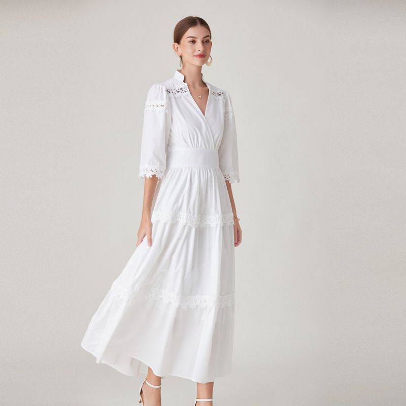 米の白いドレスのスカートのフランス式宮廷風のvネックの泡の袖の半袖のレースは大きい振り子のスカートのワンピースのロングスカートをつなぎ合わせます。