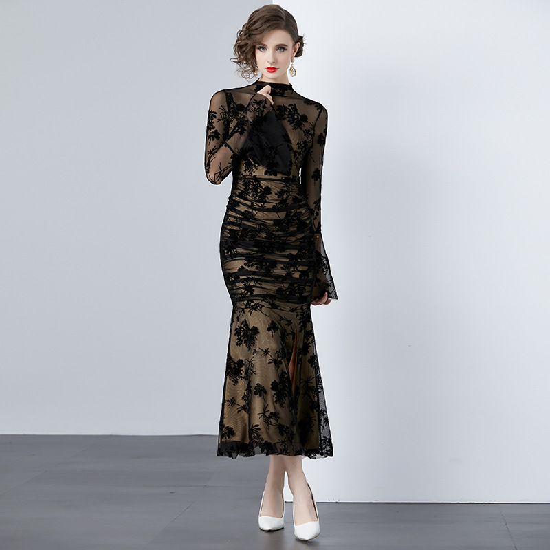 ラッパの袖の黒色の植毛のワンピースの女性の2024春の高貴なファッションの軽く熟しているセクシーな魚の尾のスカートのドレス