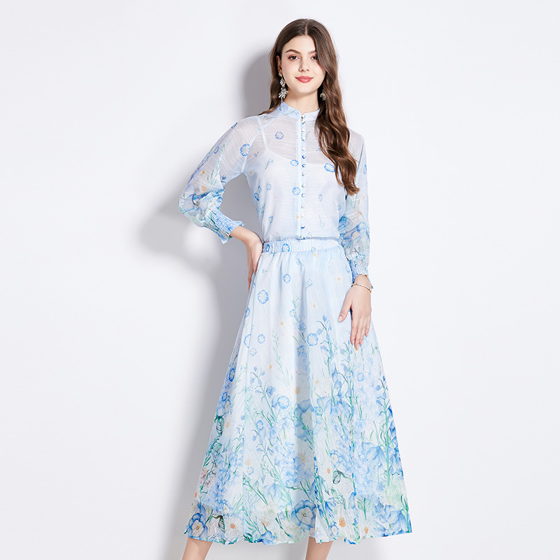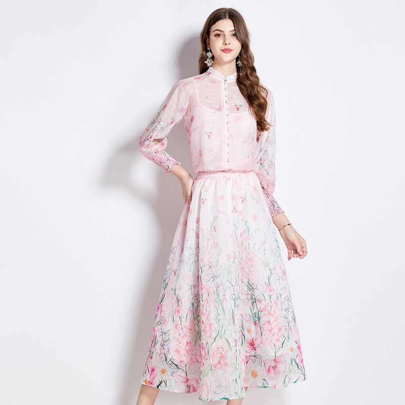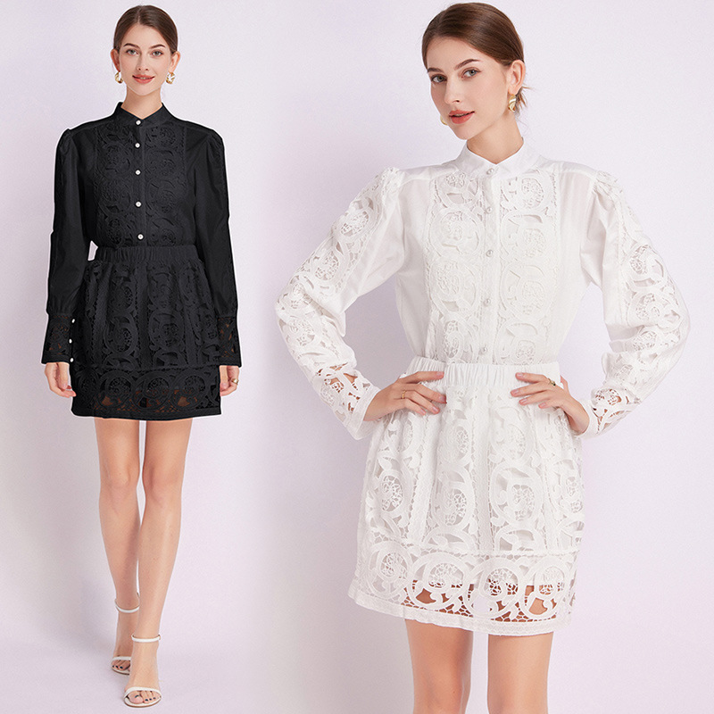 新型フランス式レトロ宮廷風2点セット2024ファッション立襟透かし彫りシャツ + ハイウエスト刺繍スカート
