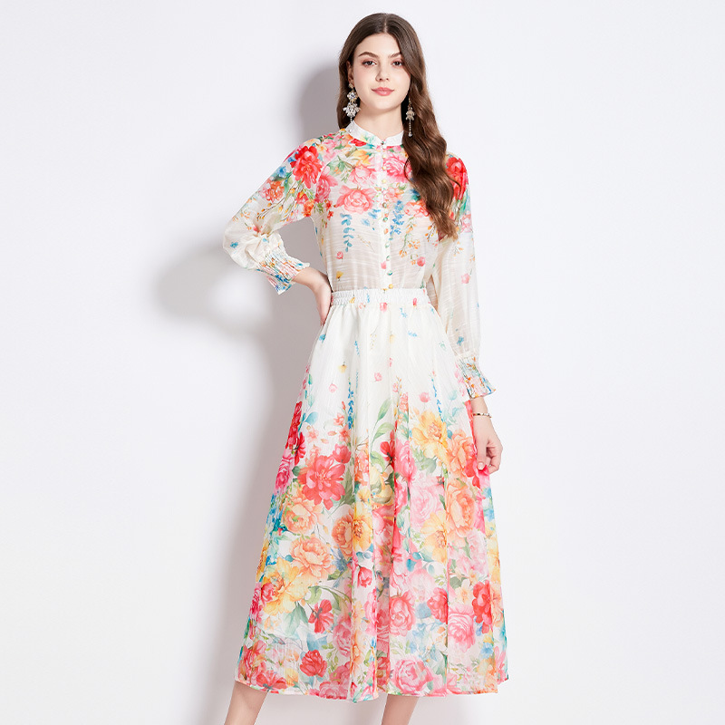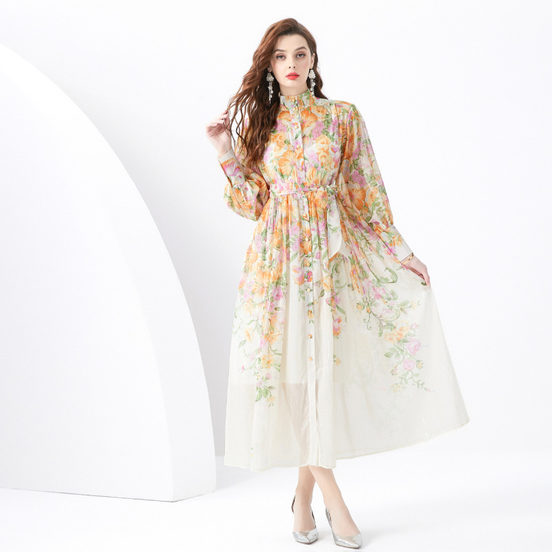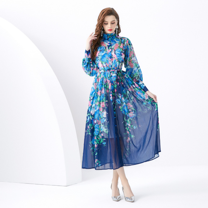欧米のプリントのワンピースの女性の立襟の長袖の高級感は腰を収めて長いスカートの小さい大衆のフランスのシフォンの妖精のスカートを縛ります。