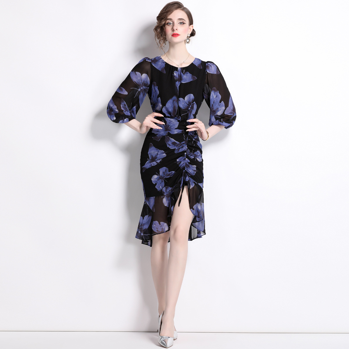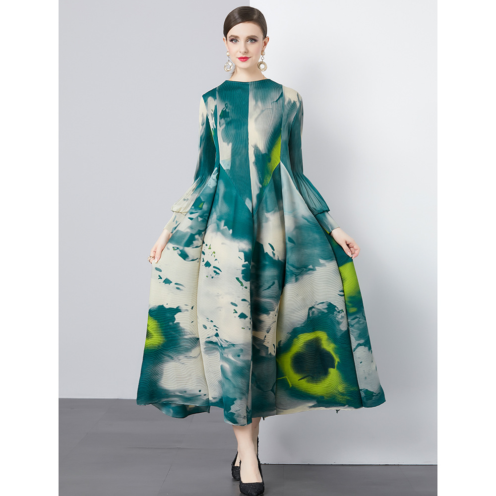 フランスの高級感のワンピースの女性の軽豪華な重工業のしわの修身の長いタイプのデザイン感はプリントのドレスのスカートに染めます。