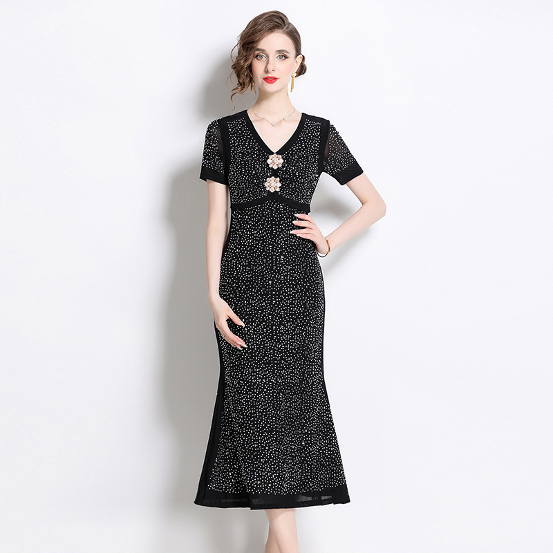 フランス式宮廷風高級感メッシュワンピース女性夏メッシュスパンコールウエストデザイン独特気質ロングスカート