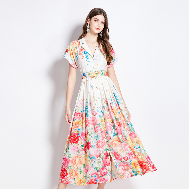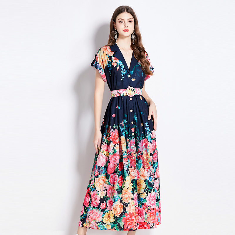 欧米のレトロなワンピースの女性の夏服の新型の名媛の気質は腰の単列を収めて襟のプリントの中の長いタイプのドレスをひっくり返します。