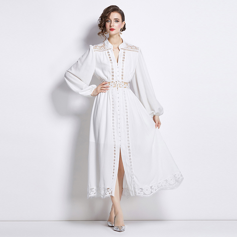 重工スパンコール刺繍レース角襟名媛軽豪華白色フレンチレース半袖ワンピースロングスカート女夏