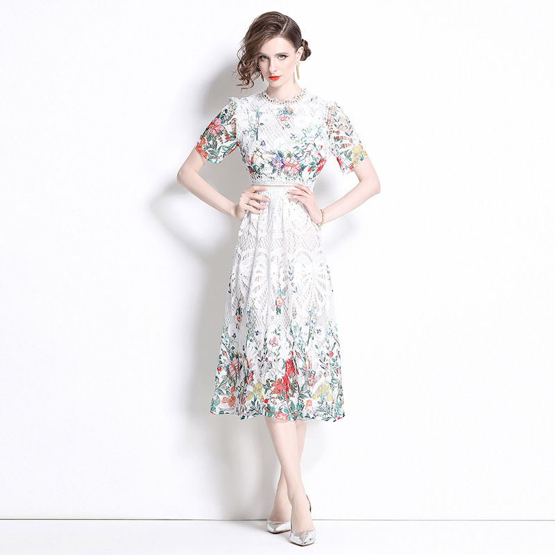 軽くて豪華な重工業の透かし彫りの水溶レースのワンピースの女性の夏のフランス式の優雅な高級感のプリントはやせている修身の長いスカートを現します。