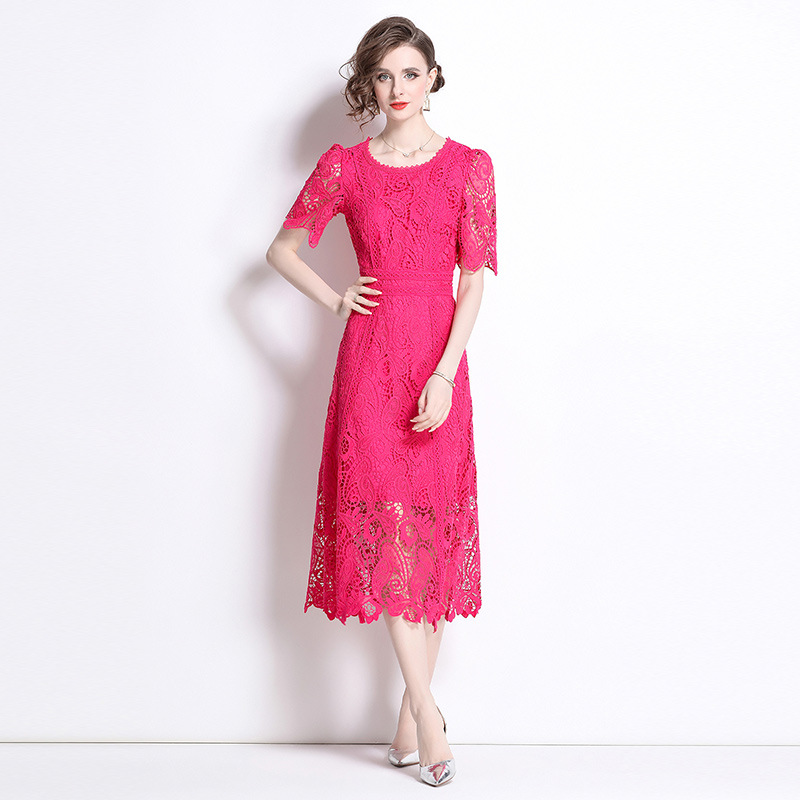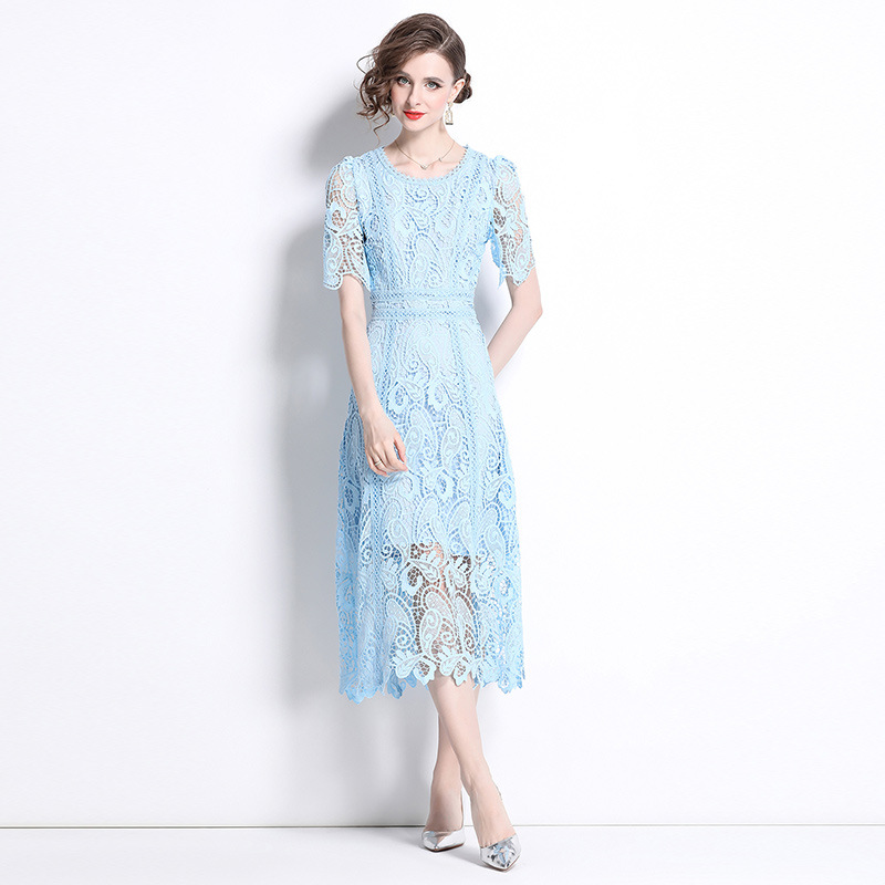 フランスの高級感のある水溶レースの修身ワンピースの女性の夏の新型の軽くて豪華なファッションの透かし彫りのプリントはやせている長いスカートを現します。