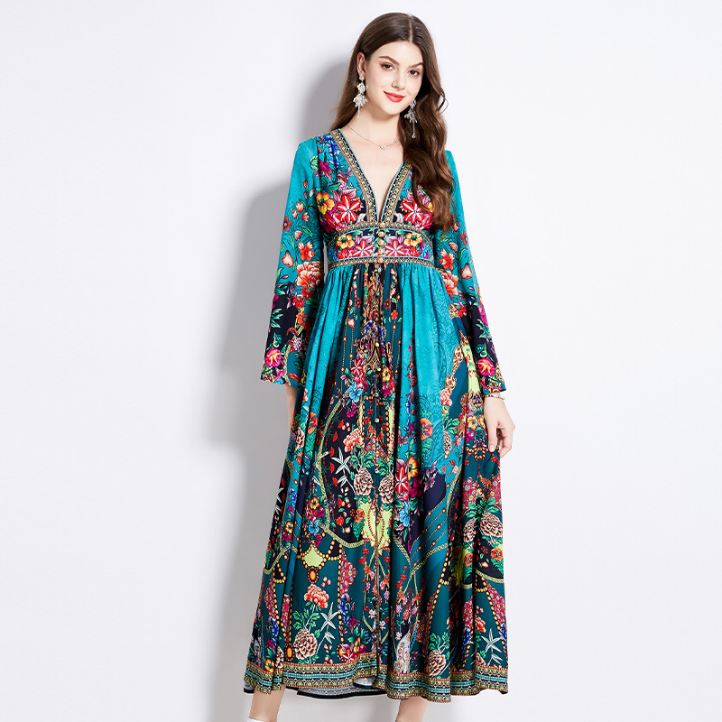 フランス式宮廷風ドレス女性vネックのボタン付きのロングデザイン感プリントワンピース