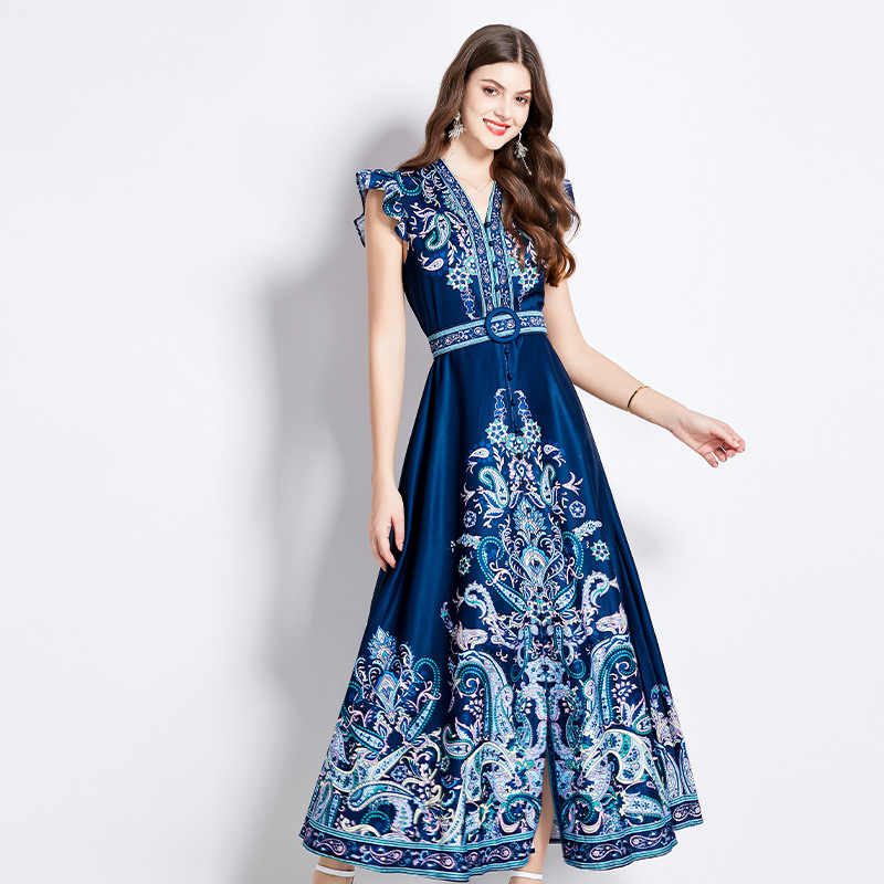 国境を越えた対外貿易女装2024春夏の新型レトロな民族風気質プリント小飛袖大振り子ワンピース女