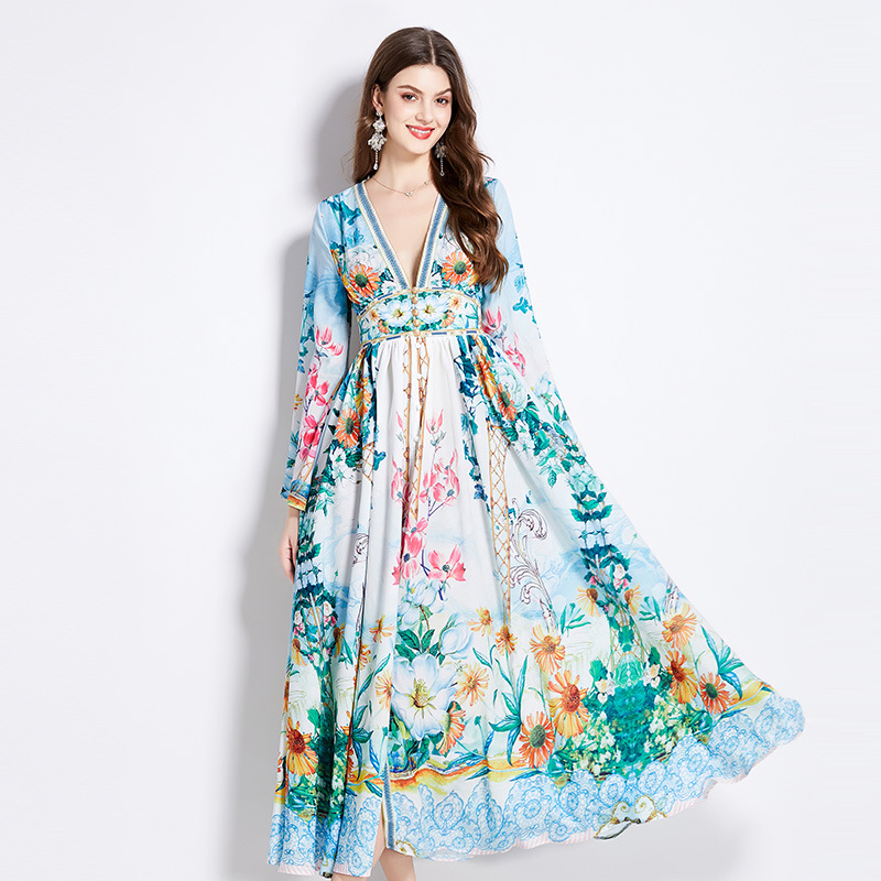 オリジナルスポット2024早春リゾート風デザイン感vネックプリント長袖ウエストワンピース